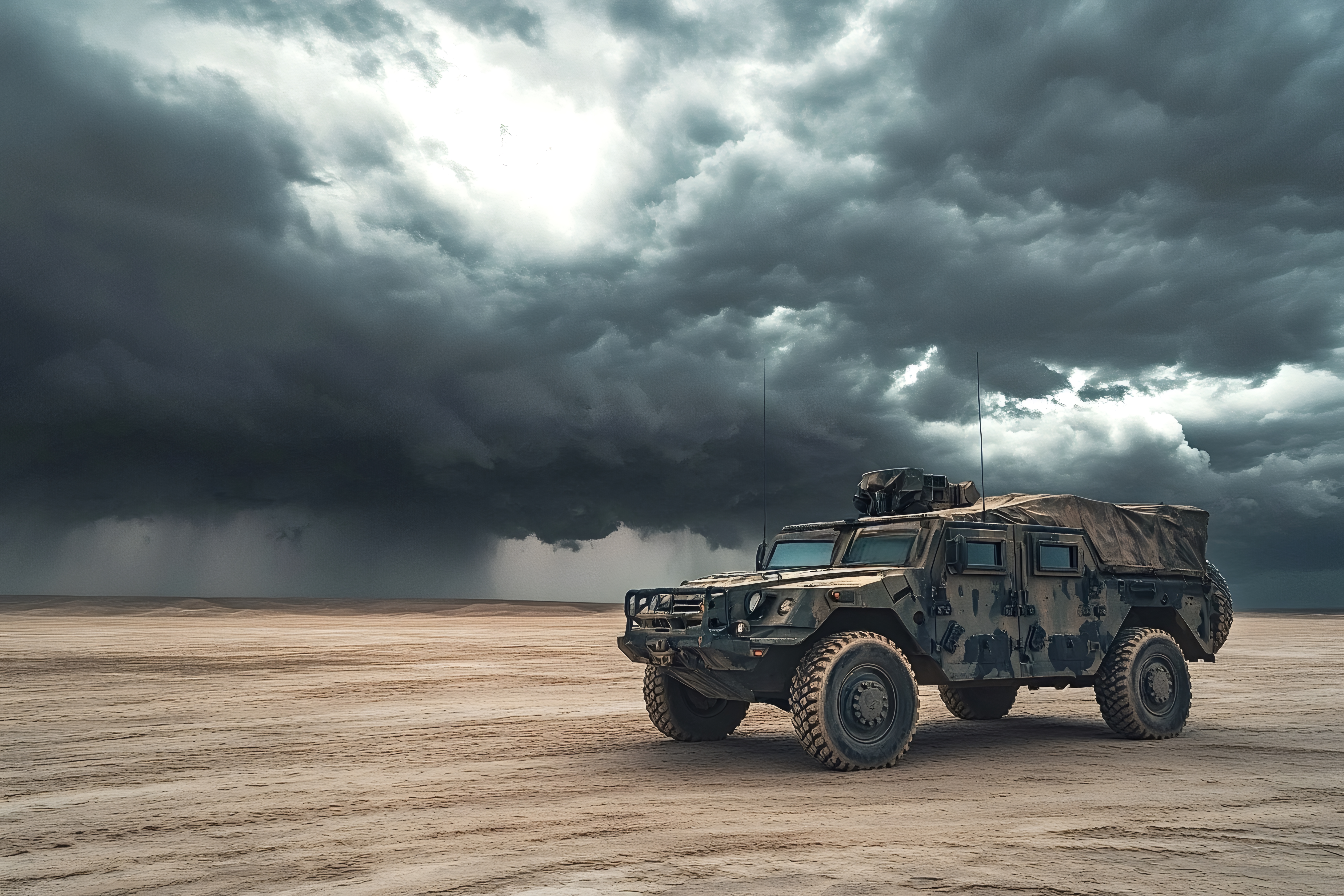 Military vehicle patrolling under dramatic stormy sky in desert
